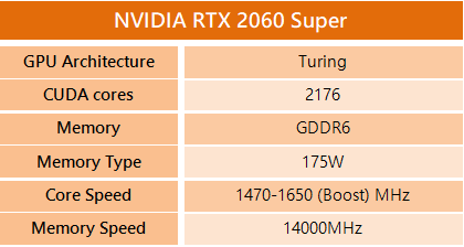 - NVIDIA RTX2060S (8GB GDDR6, 2176 CUDA)