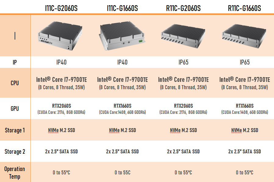 I11C-G2060S is a high CUDA Core GPGPU computer that is designed to fulfil heavy duty computing demand edge AI inference system. Equipped with NVIDIA RTX2060S and Intel 9th Gen. i7-9700TE CPU, this powerful processor can easily handle multi-sensor fusion task from data collection, data analysis to application. Some of its features as follow.
