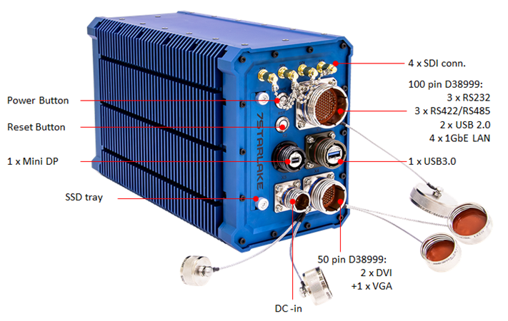 3 x RS232 + 3 x RS422/RS485 + 2 x USB 2.0 + 4 x 1GbE LAN with 100 PIN D38999 connector |